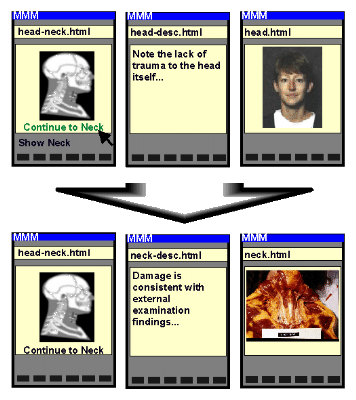 As a concrete example, consider the following scenario: A pathology instructor is preparing a corpus of information to teach students how to read an autopsy report. For pedagogical reasons, the instructor has three goals: 1) Students should always be aware of the autopsy protocol (the summarizing cover sheet for the autopsy). 2) Students should refer to both the textual description and high-resolution photographs for most sections of the autopsy. 3) Due to the nature of the current case, students should not progress past the internal examination of the neck without having already seen the external evidence relating to the neck.