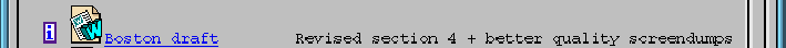 In Figure 1, the member 'trevor' has selected the event-view of the root-folder of the 'Boston paper' workspace. He sees the workspace objects in this folder--in this case, a FrameMaker and a Microsoft Word document, two links to related W3 pages, a sub-folder, the 'members' group and the workspace Wastebasket. To the right of each object, one or more icons may be displayed which signal that events have occurred concerning that object. So in Figure 1, the document 'Boston draft' has been written, while the 'Screendumps' folder has been added to the workspace since 'trevor' last logged in. Other events signalled in this way include 'read', 're-named', 'moved', 'versioned', while a 'deleted' event is signalled by the Wastebasket object becoming 'full', as in Figure 1. Members can cli ck on the event icon to get more information (such as who caused it and when it occurred), and can 'catch-up' events, similar to catching up read articles in a Usenet newsgroup, by clicking the 'Catchup events' button above the workspace listing.