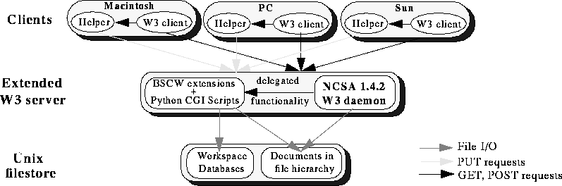 Many of these innovations required modification of the core behaviour of the HTTP server. However, rather than simply replacing server code with our own, we have extended the source so that our code is called only if the server is used to access a workspace, otherwise the server functions as a normal HTTP daemon. All the software required to install the system is public domain and commonly available, and, more importantly, we have made no modifications to clients, HTML or HTTP. We therefore believe our system retains the advantages of W3 as an enabling platform, and provides a basic, though useful, set of facilities to support a more collaborative model of information sharing.