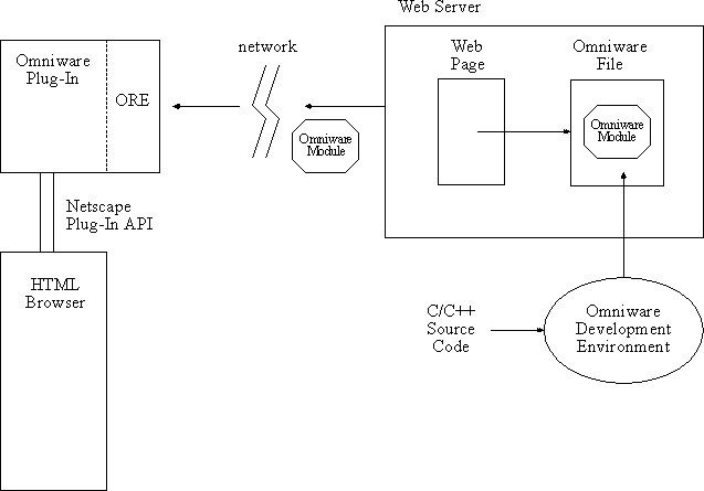 The Omniware system enables Web browsers to manage compiled mobile code modules called Omniware modules. The Omniware Runtime Environment (ORE) Plug-In enables any browser that supports Netscape's Plug-In API to run Omniware. Web system programmers can use the Netscape Plug-In API to add new facilities, such as Macromedia's Director, Sun's Java, and Colusa's Omniware to existing Web browsers and servers. Several browser companies have already announced support for Netscape's Plug-In API. As other plug-in APIs become accepted, Colusa will release compatible plug-in modules. The architecture for the system is shown in the diagram below.