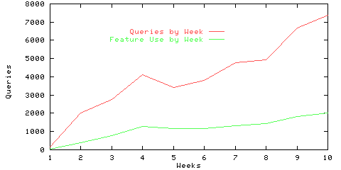 Since the MetaCrawler was publicly announced, the daily access count has been growing at a linear rate. We are also pleased with an increased use of the user options. Figure 1 plots the data points for the weeks beginning July 7 until September 30. ``Feature Use by Week'' shows the number of queries where any of the MetaCrawler's advanced features, such as verification, were used.