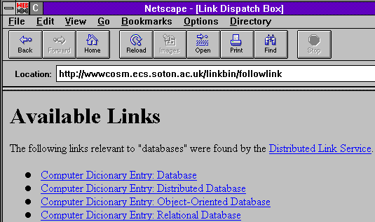 The link server then responds with a set of links which are available from the specified selection in the specified document. These links are presented to the user in the form of a 'clickable' list of destinations, displayed as a page of HTML by the Web viewer (Figure 2b).