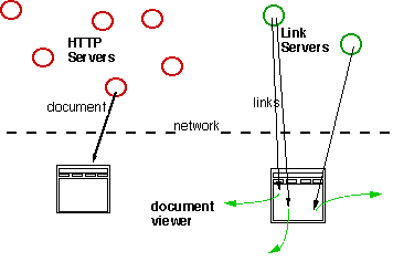 This request must then be delivered to the currently specified link server. This is done by communicating with the user's WWW browser, and requesting it to load the new URL. The results of the link request are returned as HTML, and displayed by the WWW browser. For example, in response to a request to follow a link from a particular selection, the response might indicate that no links were found, or list the links that were identified.