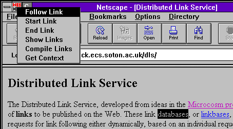 Another feature of the DLS is that it allows link following to be affected not just by the static document context of the link source, but also the reader's dynamic context: task-specific information that affects the kind of resources that they would like to follow up. A reader may choose to subscribe to a subset of many different linkbases, depending for example, on whether they are to write an essay for an undergraduate or postgraduate course on Cell Motility, or whether they are interested in Computer Science in general or Parallel Computer Architectures in particular. This is achieved by the interface agent querying its link server about the link databases it supports; the list of named databases is offered to the user as a Context menu.