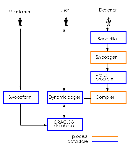 Swoopgen. This is an application generator which produces dynamic page programs from special augmented HTML files called swoop-files. Swoop files can include embedded pieces of SQL, the standard language for accessing Relational Databases [3]. The SQL inserts in swoop-files corresponds to points where information extracted from the database should be merged into the page. A tool called swoopgen translates these special swoop-files into PRO*C programs (PRO*C is ORACLE's pre-compiler to support embedded SQL statements within the C programming language), which when compiled act as dynamic page programs which will extract information from the database and present it merged into hypertext, as specified by the swoopfile. Thus, the system-designer using swoop needs only a rudimentary knowledge of ORACLE and HTML.