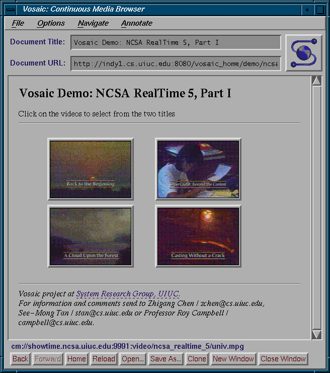 There is one argument that the functions of Mosaic should be kept at a minimum while additional functionality is left up to specialized external viewers. Work along this line has led to the development of the Common Gateway Interface[18], a standard for harnessing external programs to view files according to their MIME[9,8] types. One key reason favoring the success of Mosaic is its incorporation of inlined images with text, resulting in a semantically rich environment. Leaving the display of audio and video to external viewers causes a loss of semantic content in a hypertext document that includes these media types. Real time video and audio convey more information if directly incorporated into the display of a hypertext document. For example, we have implemented real time video menus and video icons as an extension of HTML in Vosaic. Figure 1 is a typical four-item video menu one may construct with Vosaic. Video menus present the user with several choices. Each choice is in the form of a moving video. One may, for example, click on a video menu item to follow the link, and watch the clip in full size. Video icons show a video in an small, unobtrusive icon-sized rectangle within the HTML document. Our experience indicates that embedded real time video within WWW documents greatly enhances the look and feel of a Vosaic page. Video menu items convey more information about the choices available than simple textual descriptions or static images.