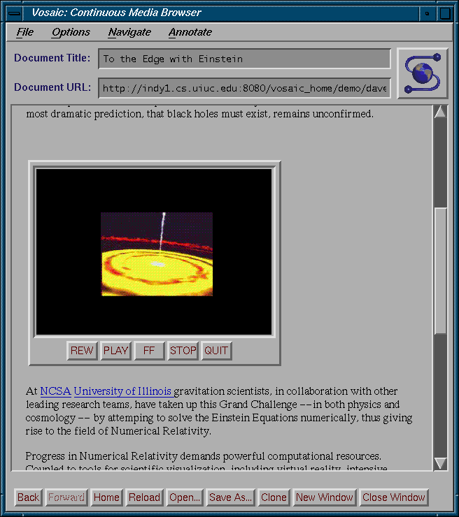 Vosaic is a vehicle for exploring the integration of video with hypertext documents, allowing one to embed video links in hypertext. In Vosaic, sessions on the Multicast Backbone (Mbone)[6] can be specified using a variant of the Universal Resource Locator (URL) syntax. For example, the URL