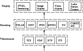 HTML documents with video and audio integrated are characterized by a variety of data transmission protocols, data decoding formats, and device control mechanisms (eg., graphical display, audio device control, and video board control). Vosaic has a layered structure to meet these requirements. The layers are depicted in figure 2. They are: