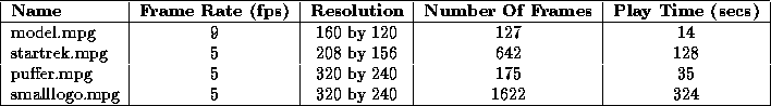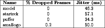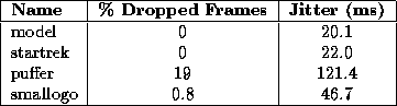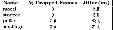 Tables 3, 4, and 5 show the results for sample runs using the test videos by our Web client accessing the local, regional and international servers respectively. Each test involved the Web client retrieving a single MPEG video clip. We used an unloaded SGI Indy as the client workstation. The numbers give the average frame drop percentage and average application-level inter-frame jitter in milliseconds for thirty test runs. Frame rate changes due to the adaptive algorithm was seen in only one run. That run used the puffer.mpg test video in the international configuration (Oslo, Norway to Urbana, USA). The frame rate dropped from 5 fps to 4 fps at frame number 100, then increased from 4 fps to 5 fps at frame number 126. The rate change indicated that transient network congestion caused the video to degrade for a 5.2 second period during the transmission.