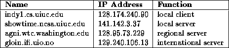 In order to observe the playback video quality, we based the client side of all our tests in our laboratory in Urbana, Illinois, USA. In order to cover the widest possible range of configurations, we set up servers corresponding to local, regional and international sites relative to our geographical location. We used a server at the National Center for Supercomputing Applications (NCSA) for the local case. NCSA is connected to the local campus network via Ethernet. For the regional case, we used a server at the University of Washington on the east coast of North America, in Washington State. Finally, a copy of our server was set up at the University of Oslo in Norway to cover the international case. Table 2 lists the names and IP addresses of the hosts used for our experiments.