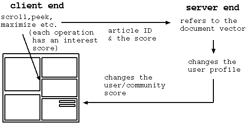 Of the many ways to build a user profile, the most common and simplest way is to ask the user to type in keywords that he/she is interested in [17]. With this approach, it is difficult to track changes in a user's interest over time and topics of interest they are not conscious of. An indirect way is to ask the user to provide a score for articles he/she reads, and to compute the weights of keywords from the score [18][19]. This method also requires the user's conscious involvement, which is often annoying. A more subtle way is to consider the time that the user spends on each article, as in prior work on USENET News [20], where it seems to have worked fairly well. Unfortunately they insisted that subjects devote their entire concentration to the task of reading the article and not take breaks, which is not a very realistic solution. In the Krakatoa Chronicle, we included some of these methods, namely typing explicit keywords and/or adding a score to each article. However, the system works even without explicit user involvement. Since anticipated interest values are explicitly represented on the score bars the user will notice that the profile has indicated an erroneous value and will then proceed to give explicit feedback which will correct the profile.