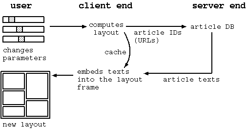 In the Krakatoa Chronicle, this flexible layout control was implemented by having the applet code on the client fetch articles from the server side (see Figure 6). A client-side cache allows for pre-fetching and significantly reduces the cost of browsing and re-layout. Whenever the user changes the setting of layout parameters (via the sliders), a new layout is computed. Article files are cached, and the agent fetches new articles from the server end only if needed.