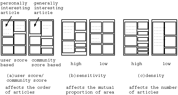 When the user chooses the "Create Today's Newspaper" button, each article's personal and community weights are computed, and a java newspaper applet is composed by the cgi-script and sent to the client. The applet computes the layout using each article's weight and other factors, and displays the composite newspaper after getting formatted pieces of text from the server. When the user chooses the "Read Today's Newspaper" button, the last newspaper viewed by the user is sent over. This allows users to return to the same newspaper even though their profiles have changed.