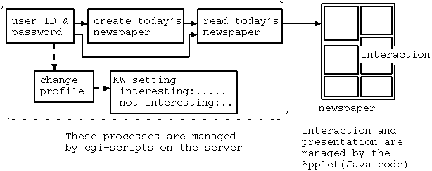 A set of server end programs fetch each day's articles, translate them into plain text, index them using SMART, and help users register and log on. This is implemented using cgi-scripts written in Perl. Code size of the script to maintain the database and create newspaper is about 500 lines, and the one to handle the login sequence, create new accounts and interact with the user is about 2000 lines. A set of client end programs manage the layout of the newspaper and user interaction. They are written in Java Release 1.0 Alpha3. Code size is about 3000 lines.
