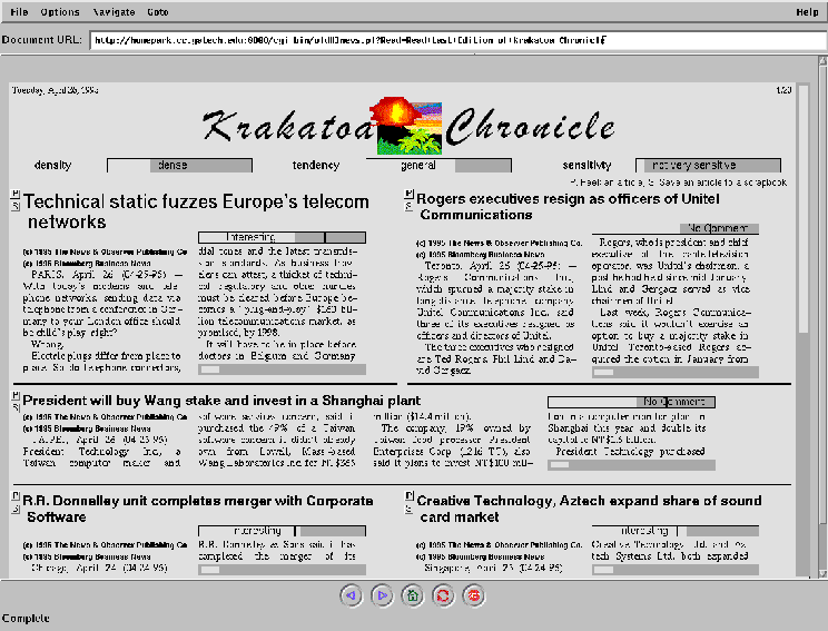 Figure 4 shows a typical screen of The Krakatoa Chronicle. It is the first web newspaper to attempt a realistic rendering of a newspaper with a multi-column format to resemble actual newspapers, and utilize embedded widgets for convenient browsing. The newspaper is divided into a set of pages, with articles of greater importance appearing earlier in the sequence. A page-scrollbar is available for browsing at the page level. Each page is divided into a set of article widgets, separated by 'bars' which can be dragged. An article widget holds the contents of an article and supports various browsing techniques.