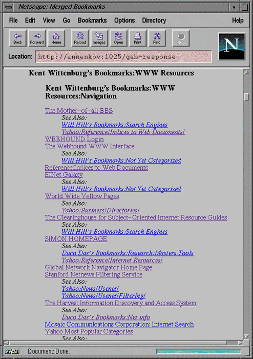 Figure 2 shows a screen dump of an HTML document, being viewed through a commercial World Wide Web browser, that is the result of a query to the GAB server to include a set of participating users' bookmark files (along with Yahoo). The subject headings are indicated as paths from the root of the bookmark tree files. URLs that appear in other GAB subject trees are evidenced as "See Also" crosslinks that appear indented below the URLs in question. The user can then browse to potentially related URLs by clicking on a cross reference link that will jump to that portion of the document that includes other subject listings that also included that same URL. So, for example, note that the URL titled "The Mother-of-all BBS", categorized under Kent Wittenburg's bookmarks with the subject path "WWW Resources:Navigation" also appears under Will Hill's bookmarks under the category "Search Engines." A click on the latter link will jump to that category of Will Hill's, where related resources may then appear.