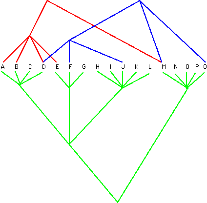 Figure 1 is an abstract example of such a merged subject multitree, where each subject tree is indicated with a different color and the categorized URLs are indicated as capital letters at the trees' leaves. Subject headings would be attached to each of the nonterminal nodes of the trees. This example only shares tree structure at the terminal nodes of the trees, which is consistent with the sharing of links that occur across personal bookmark or hotlist files, but it should be noted that multitrees can share nonterminal nodes as well.