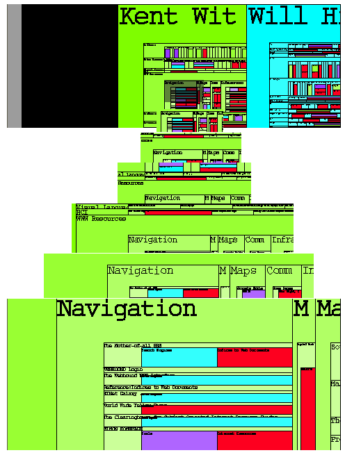 Consider the visualization encoding exemplified in Figure 5. "Navigation" is a subject heading. It is assigned a rectangle colored by its host subject tree. This green rectangle contains several other green rectangles that represent the URLs categorized as navigation resources. Those URLs that appear elsewhere in the multitree structure under different subject categories enclose additional rectangles of different colors, one for each cross-referenced subject heading.