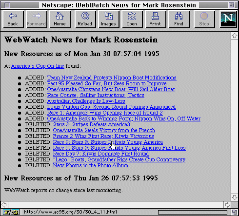 We developed WebWatch as a portable service to help users keep abreast of new developments in their favorite World Wide Web pages. WebWatch makes it easy to monitor any Web page in HTML format. On a daily basis, WebWatch alerts its users to new Web resources as they appear at monitored locations. WebWatch outputs an HTML formatted page which reports added and/or deleted resources at any monitored location in the Web. For example, Figure 6 shows the result of a WebWatch report for the resource "America's Cup On-line."