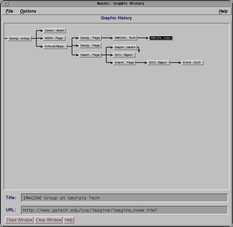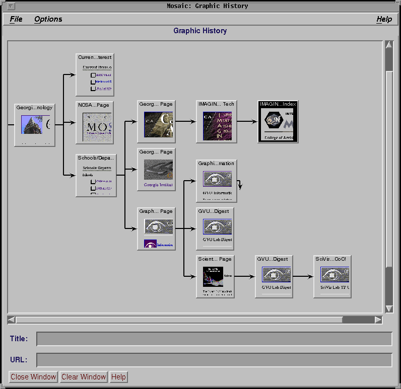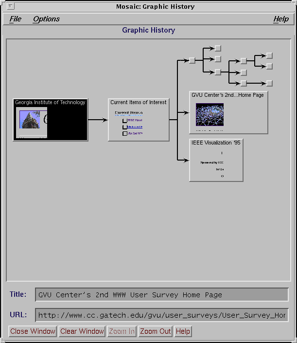 MosaicG is derivative work of the National Center for Supercomputing Applications' (NCSA) Mosaic Web browser, version 2.5. It enhances the history-keeping facility of the browser by providing a two-dimensional view of the documents a user has visited in a session, as shown in Figure 1. It is intended as an easy-to-use aid in navigating a collection of hypertext documents. By presenting titles, Uniform Resource Locators (URLs), and thumbnail images of the documents a user has visited in a session, the Graphic History View allows a user to easily recognize a previously visited document and provides an easy way for the user to revisit that document and analyze the structure of a set of hypertext documents.