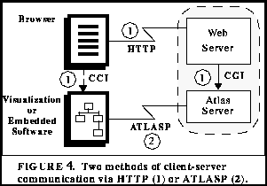 Figure 4 depicts two mechanisms for client communications. In the preferred method, the client visualization software talks ATLASP directly to an Atlas server. The other method uses HTTP and invokes a CGI process which provides the gateway interface to the Atlas server. Non ATLASP visualization software can immediately leverage off of Atlas services. An extension to HTTP could be provided via the newly proposed Protocol Extension Protocol [Khare 1995] to allow a tighter integration of Atlas and Web servers.