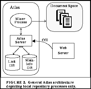 Figure 2 depicts the overall architecture of Atlas. The left side of the figure contains some of the core repository elements. In an ideal publishing situation, the authoring tools used to create content for the repository are an integral part of the architecture, where the meta-information for the newly formed content is automatically extracted and stored, hyperlinks are extracted and stored, and the integrity of the content, meta-information and hyperlinks is verified [Pitkow & Jones 1995]. Atlas was designed to perform updates and notifications in real-time, as part of an integrated, front-end publishing environment. In the absence of such environment, Atlas performs these functions on a configurable, periodic basis. Thus, we are guaranteed that within a certain time frame, the meta-information and hyperlink databases will be locally consistent.