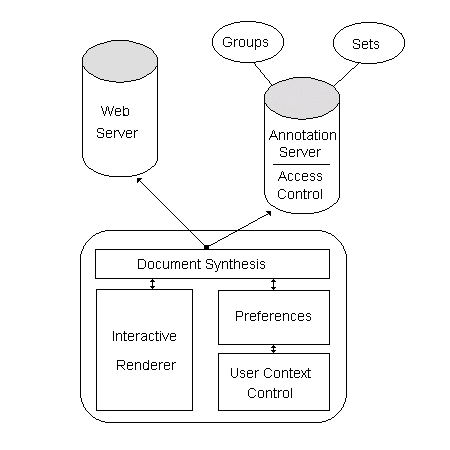 The original prototype was able to leverage elements of the ComMentor system; in particular, we borrowed the merge library (to create a synthesized document with in-place annotations), the metaserver (to store and serve annotations), and the initial model of users and annotations. For comparison, Figure 2 illustrates the high-level ComMentor design.