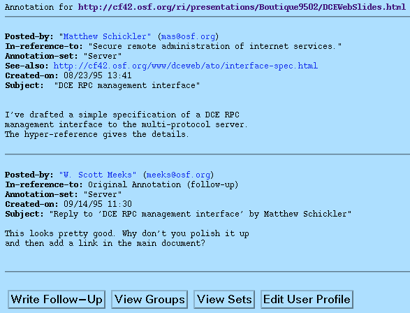 The following usage scenario illustrates aspects of our target usage model. The user, while viewing a document anywhere on the Web via her favorite browser, notices that one of her department colleagues has added a comment regarding a sentence in the document. When the user asks to view the comment, she is presented with both the comment and the opportunity to respond to it. Instead, she decides to comment about the whole document. To do so, she invokes the annotation submission mechanism. After creating the text of the annotation, providing a subject header, and citing a relevant URL, she submits the annotation. The user then notices that her annotation is now available for viewing by authorized members of her group. Furthermore, the annotation system notifies those group members that an annotation of interest has been posted.