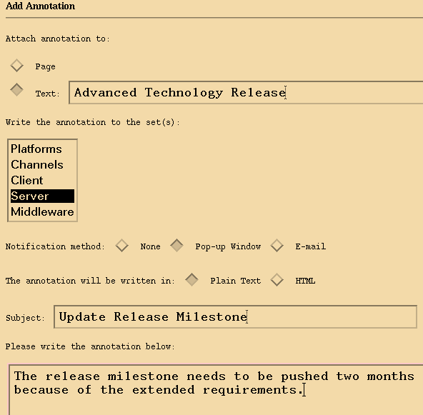 The flow of control for submitting annotations is very similar to that of editing group membership. Directives, with and without arguments, are passed to the GrAnT for processing. The key difference in this case is that the HTML form returned to the client is specific to writing an annotation. This page includes a number of input fields and radio buttons that can be used for entering the annotation text and selecting options. As illustrated in Figure 5, one of the options allows the user to attach an annotation to a specific piece of text in the document by entering this text in an input box (otherwise, the annotation is attached to the document as a whole).