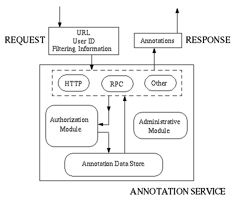 A positive property of this architecture is that clients need not use a specific common access mechanism for querying and creating annotations. For example, one annotation server could serve some clients that use the strong security guarantees of DCE-RPC and other clients that use HTTP. Similarly, an interoperability protocol, such as that being developed within the Digital Library Initiative, can offer a diverse set of clients access to annotations maintained by a variety of annotation servers, even when the clients and annotation servers run within different administrative domains. In addition, this modular approach permits us to add functionality for availability and scalability, such as replication and index sharing.