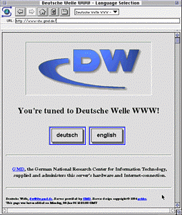 By October 1, 1994 DW was on the Web! The service was announced on different national and international mailing lists as well as the central Web page of all German Web sites. In addition DW started advertisement in their radio and tv programs.