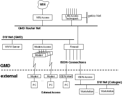 DW is connected by ISDN to the Firewall system. One interface is reserved for DW only to transfer raw text material from DW to gekko for conversion into HTML as well as to give some selected employees of DW full Internet access via GMD.