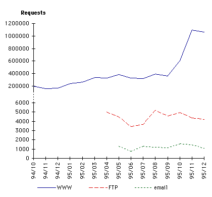 The most important service for Deutsche Welle is the Web server. During the first months the number of requests increased slowly. Since October 95 parts of the program of the Süddeutsche Zeitung, one of the most popular newspaper of Germany, are hosted on the Deutsche Welle server too. As a result the number of requests grows by nearly 300%. In November 1995 there were 1,091,775 requests in total with a maximum of 17 requests per second. In December there was a slightly decline at and after Christmas but the numbers in January so far promise a new maximum.