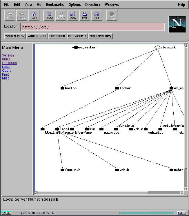 OzWeb contacts the Oz server to perform the command on behalf of the Web based user in the same manner that the TTY client would supply the command and its parameters. As mentioned in the Architecture section, certain URLs are handled by the HTTP Proxy itself, without contacting the server application. For example the main startup screen of our system is represented by the following URL: