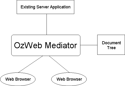 Over the course of its research, our group has developed several clients for use with the Oz system, including a TTY-based client, an Xview client, and a Motif client. In creating our mediator, known as "OzWeb", we decided to base our work on the TTY client. We were aiming to create a mediator that had no user interface -- it was to run as a daemon process on a machine connected to a LAN. While X toolkits like Xview and Motif allow for the creation of an application without any windows, it was easier to begin with a minimalist interface (like the one in our TTY client) and simply strip away any pieces we didn't need.