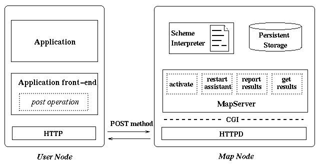 A MAP node is a WWW server that supports mobile assistants---it runs a httpd daemon and provides MapServer, a CGI script with the following components: the modified Scheme interpreter, functions implementing MAP primitives and local service interface. Figure 2 present the structure of the implementation.