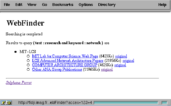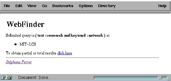 The user query is a conjunction of attributes. Currently, we support four attributes corresponding to different structures of a HTML document: text - all terms of the document, title - terms of the document title, keyword - terms appearing in the headers, and author - terms appearing in the address part of a HTML document ( <ADDRESS> tag). For example, query keyword:network and author:smith matches all documents with term network in the headers and signed by smith. The application confirms the activation by returning a HTML document with an anchor for the collector capability (Figure 6). This document is later used for obtaining results.