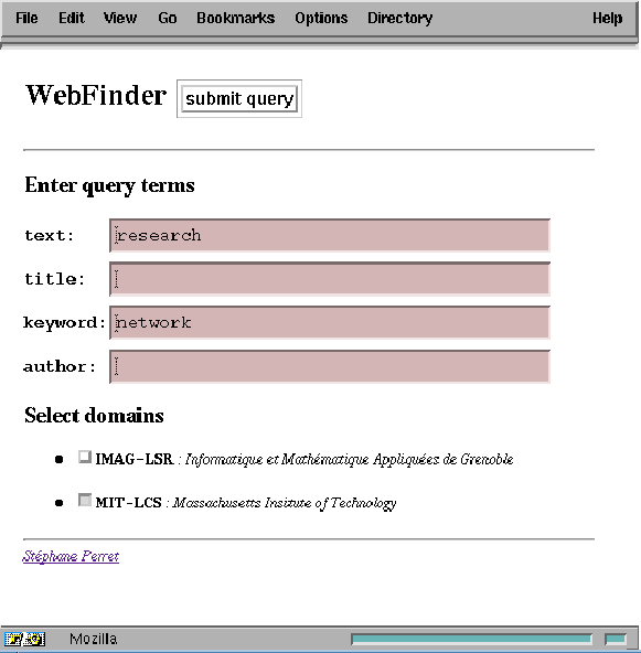To validate our MAP platform as a support for information access applications, we have developed an application that searches for HTML documents on a set of WWW servers. The application front-end is simply Netscape WWW browser and a CGI script that presents to the user a FORM document to enter the parameters of a search: a query and DNS (Domain Name System) domains containing WWW servers on which the search is performed in parallel (Figure 5 ). Each proposed domain includes a MAP node that allows execution of assistants that access HTML documents on WWW servers in the domain. The scope of the search is defined by a root URL to start with and a regular expression on the name of WWW servers.