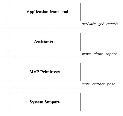 The MAP model provides flexible support for programming new applications that require disconnection transparency, mobility, and parallelism. The functional architecture of the model is presented in Figure 3 . It is composed of four layers: application front-end layer that provides user interface, activates an assistant, and checks for results, assistants layer that performs useful work for the application and are programmed using MAP primitives, MAP primitives layer that performs basic MAP operations, and system support layer that performs checkpointing and communication.