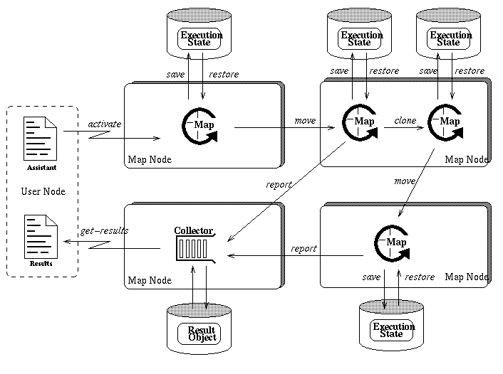 Telescript is a software platform for remote programming in an electronic marketplace . The basic entities are agents and places. An agent is an active object that carries data and procedures. Agents occupy places representing real world entities such as a shop or a box office. Agents can change places using a go instruction and communicate with other agents using a meet instruction. The MAP programming model is similar to Telescript. However, in Telescript, the execution model is based on rendez-vous between agents. The details of the meet instruction are not given in the white paper [15 ] and it is not clear how a client agent requests a service from a server agent (some kind of a communication protocol must be defined between these two entities). In MAP, there is no server agent that represents a service. Instead, an assistant migrates to and executes its code on a server node, so that assistants can be thought of as passive mobile processes programmed by means of a high-level interpreted language. Compared to Telescript, MAP offers assistant cloning to exploit inherent parallelism in a large scale network. Returning results is also different in MAP: at each stage of the execution an assistant can report results.