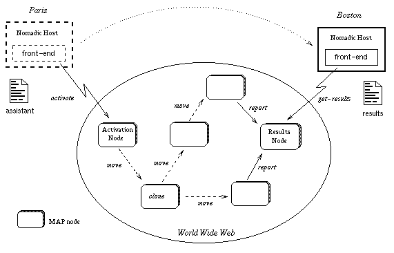 Developing an application using MAP consists of writing an application front-end and a program for an assistant. The application front-end activates the assistant on a chosen MAP node (Activation Node) and specifies another node (Result Node) that holds collector object for results. An application may run on a nomadic or a mobile node as well as a fixed-location node. The execution of assistants takes place on MAP nodes set up on WWW servers. Figure 4 presents an example of an application that runs on a nomadic host and on several WWW servers. The user activates an assistant in Paris, goes to Boston while the assistant and its clones execute in the network, and requests the results on arrival in Boston.