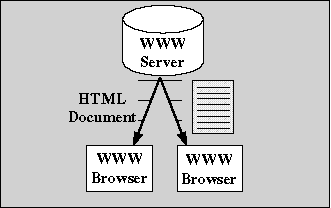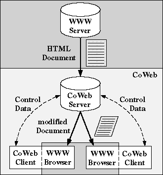 The CoWeb architecture introduces an additional unit between the original WWW server and the cooperating clients (cf. figure 2). From the perspective of the WWW server, the CoWeb server acts as a conventional client. From the perspective of the clients, the CoWeb server looks like a conventional server. Additional functionality is added to the clients through Java scripts. Thus, any conventional servers and Java-compatible clients can be used with no manual changes. The CoWeb server modifies HTML documents by replacing HTML units with Java applets which enable cooperation. Additionally, it is the central control unit for cooperation. The CoWeb clients are the cooperative user interfaces which are linked to the original WWW client.