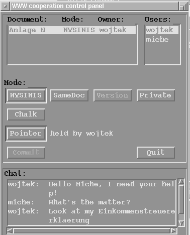 The visible indication for CoWeb is the control panel. The control panel gives an overview on documents in the conference list and on users which participate in the actual session. Users can switch between different cooperation styles. A subwindow is offered for textual chatting (cf. figure 4).