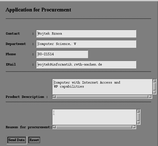 In our second scenario we focus on the typically form based communication in the administration. In a big enterprise an employee wants to have a new computer. Therefore, he has to fill a special form, the application for procurement, which is sent to the purchasing department. Beside a description of the computer, he has to explain why he needs it, that no guidelines concerning his place of work are hurt and all recommendations about ergonomics are met. As the enterprise uses an information system, the application for procurement is offered as an HTML-document (cf. figure 6).