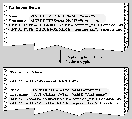 by applets like APP Class=CoText. The outward look of the document is still the same, although methods which support cooperative work have been integrated.