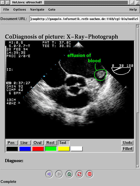 In the following scenario a general practitioner (GP) has difficulties to analyze an ultrasonic photograph. As he wants to consult a specialist he asks a radiologist to join a CoWeb session. The GP enters the http address of the CoWeb start page. An applet, which is part of this initial page, starts the CoWeb client and establishes connections to the WWW client and to the requested CoWeb server. On the GP's screen the CoWeb client window comes up and offers the possibility to communicate to all people which are connected to the same CoWeb server. As the radiologist has also joined the session, they now can start to discuss about the ultrasonic photograph. After the GP has entered the name of the ultrasonic photograph into the appropriate HTML form, an HTML document that includes the photograph is created by a cgi program. The CoWeb server then replaces the image on the HTML page by the corresponding java applet. This applet enables the users to point to special parts of interest, to draw rectangles or ovals around parts of the image or to include text (cf. figure 5). The GP chooses the WYSIWIS mode. Thus, both parties can use the methods at the same time and can see which parts are of interest to the other party.