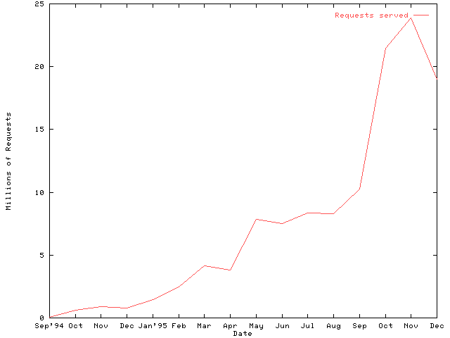 At about the time of the First International Conference, a proxy mechanism was introduced into the the CERN HTTP server[3]. New versions of Mosaic made the use of this facility transparent to the user and proxying started to become a viable proposition. HENSA Unix continued to use the CERN server for almost a year but with the increasing popularity of the cache, the forking process model used by the CERN server started to place a higher and higher load on our hardware. At this point the caching service was still experimental and not receiving its own funding.
