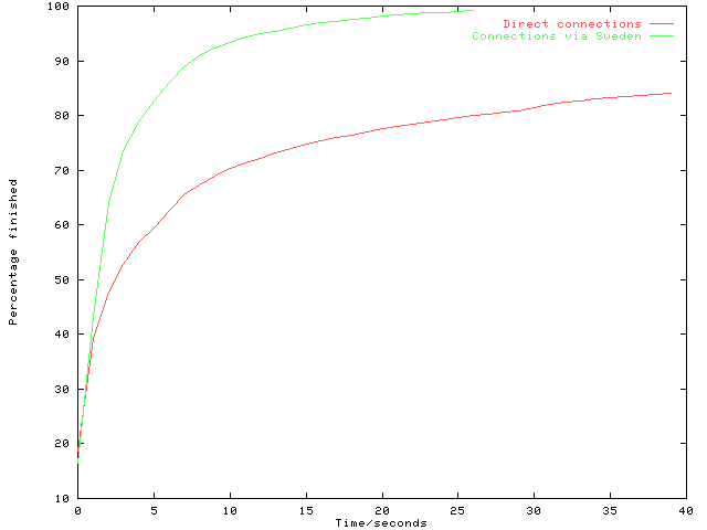 In order to demonstrate the effectiveness of the cache in a situation where there is spare bandwidth, HENSA Unix asked for help from Lulea University in Sweden. The UK has a 2Mbps connection to Scandinavia which typically runs at 50% capacity. Scandinavia has a 34Mbps link to the US which is running at well below full capacity. By directing the HENSA Unix cache to make use of another proxy at Lulea University we were able to test its performance with, what was virtually, a dedicated 1Mbps line. In order not to place too great a load on the Lulea server, and in order to be able to compare the two routes, direct and via Sweden, only two out of the five machines operating the cache at HENSA Unix were configured to go via Sweden. In addition it was only the .gov domain that would be fetched by that route. This resulted in about 17,000 requests to the Swedish proxy over a two day period. The results are clear from Figure 2 which shows the percentage of all requests that have been successfully serviced within a specific number of seconds.