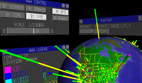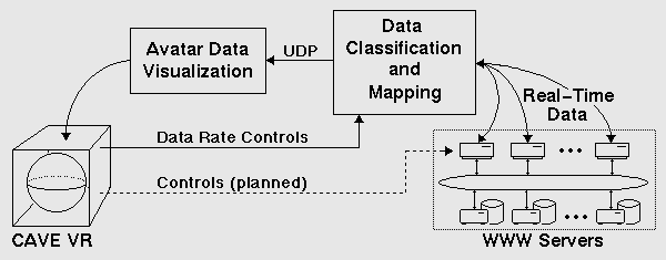 To integrate the geographic mapping of WWW requests with our existing analysis software and to support real-time data reduction and interaction, we decoupled analysis of the WWW server logs from the virtual reality system. The only medium of data exchange between the virtual environment and the analysis system is the Pablo self-describing data format [2], an extensible data meta-format with embedded data descriptions. This decoupling improves system performance and increases the flexibility to adapt the system to evolving goals.