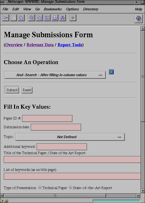 <HTML> <HEAD> <TITLE>WWW95: Manage Submissions Form</TITLE> <BASE href="http://.../manage_submissions/"> </HEAD> <BODY> <H1>Manage Submissions Form</H1> <H3>(<A href="Overview.html">Overview</A> / <A href="Relevant_Data.html">Relevant Data</A> / <A href="Report_Tools.html">Report Tools</A>)</H3> <HR> <FORM METHOD="POST" ACTION="/cgi-bin/dbtool.cgi"> <H2>Choose An Operation</H2> <SELECT NAME="operation"> <OPTION VALUE="AND"> And-Search - After filling in column values <OPTION VALUE="OR"> Or-Search - After filling in column values <OPTION VALUE="KEY"> Key-Search - After filling in paper ID # <OPTION VALUE="INSERT"> Create Submission - After filling in column values <OPTION VALUE="UPDATE"> Update Submission - After changing appropriate values <OPTION VALUE="DELETE"> Delete Submission - After filling in column values <OPTION VALUE="CLEAR"> Clear Form - Clears all values </SELECT> <A href="Instructions.html#operation"><IMG src="Images/hlp_button.gif" ALT="?"></A> <HR> <INPUT TYPE="submit" VALUE="Submit"> <INPUT TYPE="reset" VALUE="Reset"> <HR> <H2>Fill In Key Values:</H2> <INPUT TYPE="hidden" NAME="dbms" VALUE="oracle"> <INPUT TYPE="hidden" NAME="dbms_table_name" VALUE="submissions"> <INPUT TYPE="hidden" NAME="primary_table" VALUE="submissions"> <INPUT TYPE="hidden" NAME="form_name" VALUE="submissions_form.html"> Paper ID #: <INPUT name="submission_id.c.submissions.pm"><BR> Submission date: <INPUT name="submission_date.d.submissions"><BR> ... List of keywords (as on title page): <INPUT NAME="keywords.c.submissions"><BR> <BR> Type of Presentation: <INPUT TYPE="radio" NAME="type.c.submission.r" VALUE="P"> Technical Paper <INPUT TYPE="radio" NAME="type.c.submission.r" VALUE ="R"> State-of-the-Art Report ... Decision: <SELECT NAME="decision.c.submissions"> <OPTION VALUE="NULL">Not defined <OPTION VALUE="1">Accept <OPTION VALUE="2">Reject <OPTION VALUE="3">Propose as poster </SELECT> <A href="Instructions.html#decision"><IMG src="Images/hlp_button.gif" ALT="?"></A> </FORM> </BODY> </HTML>